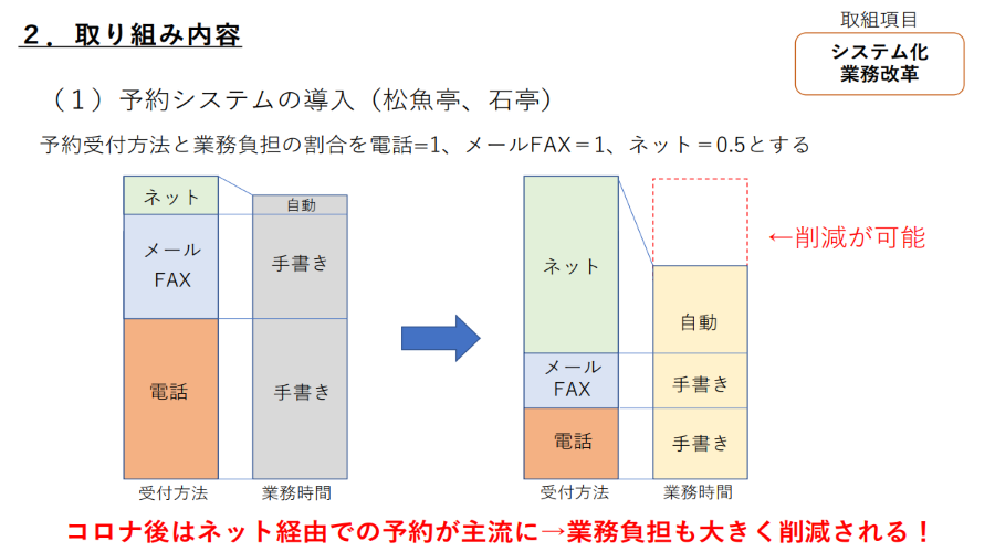 1つ目は予約システムの導入です。予約システムの導入により業務負担の削減、新規販売先の獲得、予約内容の修正事項のリアルタイムでの反映など、様々な効果に繋がりました。