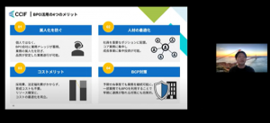 BPOを利活用することで、1.属人化を防ぐ、2.人材の最適化、3.コストメリット、4.BCP対策の4つのメリットがあることを説明しました。