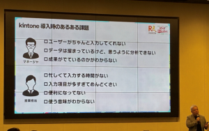 まずはkintone導入時に発生するそれぞれの立場からの悩みとして。管理者側からは、「データを入力してくれない」や「成果が出ているのかがわからない」、等があり、利用者側からは、「入力が手間」や「使う意味が解らない」などの課題があることを紹介しました。