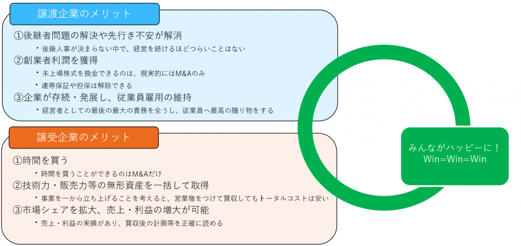 M&Aは、売り手企業にとっては後継者問題の解決や従業員の雇用維持、買い手企業にとっても事業立ち上げよりも早く安く業容拡大が可能となるなどのメリットがあります。
